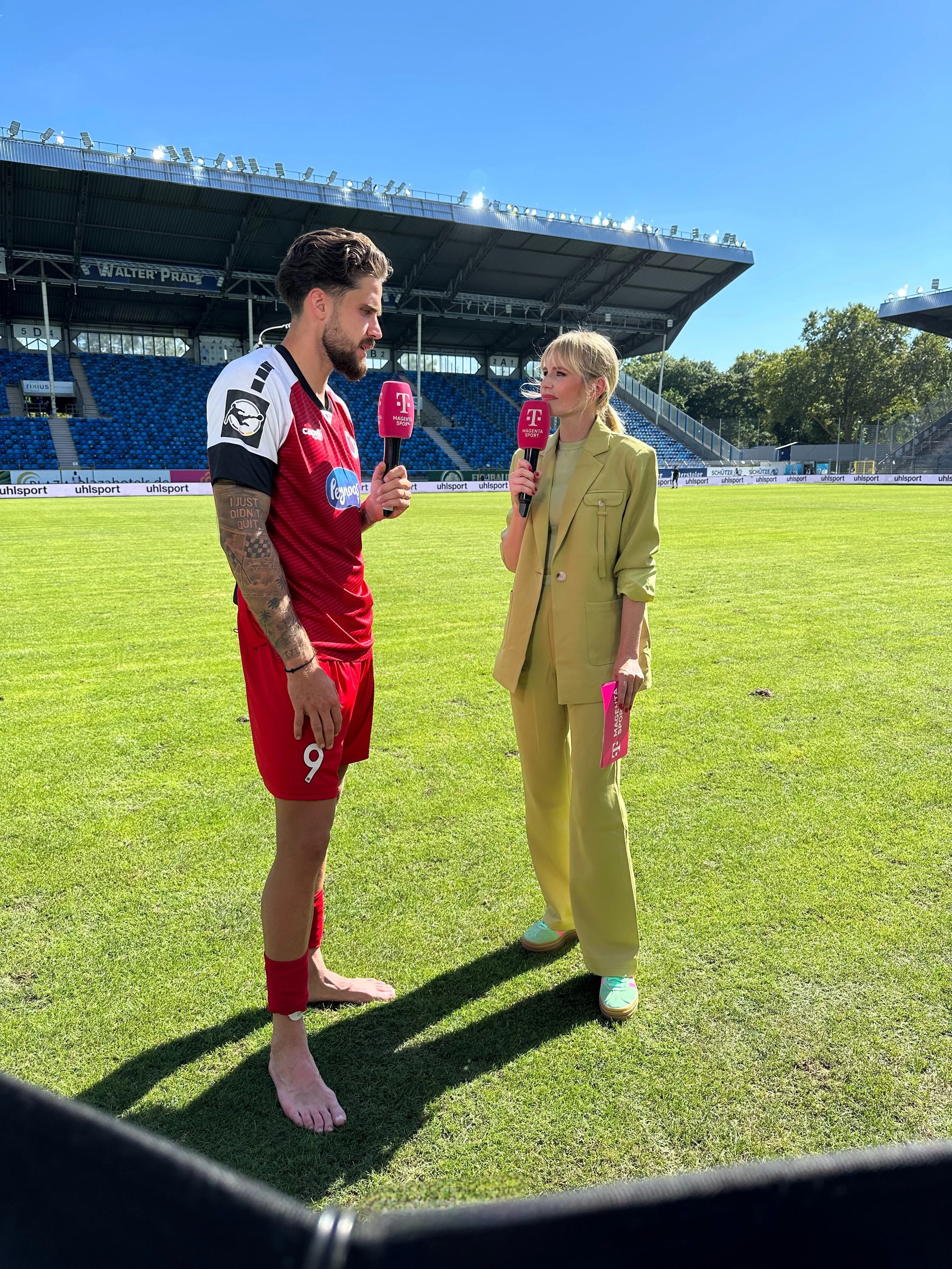 Am 2. Spieltag schon habe ich als Moderatorin bei Magenta Sport einen unvergesslichen Moment erlebt, der mir noch lange in Erinnerung bleiben wird. Es war der spektakuläre Rückfallzieher von Lex-Tyger Lobinger für Viktoria Köln im Spiel gegen Waldhof Mannheim – ein Tor, das von vielen als das „Tor des Monats“ gefeiert wurde.